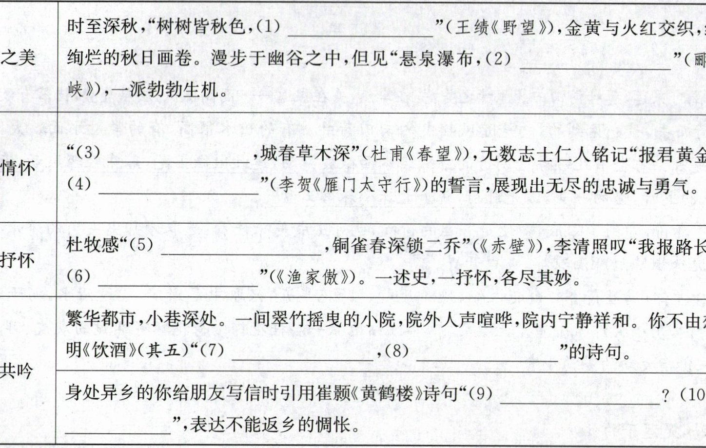 6. (1)山山唯落晖 (2)飞漱其间 (3)国破山河在 (4)提携玉龙为君死 (5)东风不与周郎便 (6)学诗谩有惊人句 (7)结庐在人境 (8)而无车马喧 (9)日暮乡关何处是 (10)烟波江上使人愁