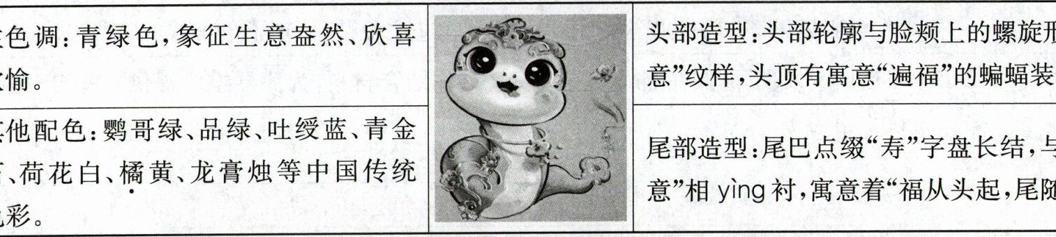 |主色调:青绿色,象征生意盎然、欣喜欢愉。||头部造型:头部轮廓与脸颊上的螺旋形状为“如意”纹样,头顶有寓意“遍福”的蝙蝠装饰。|