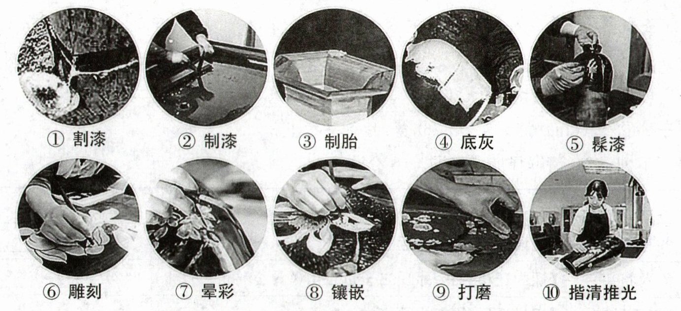 ① 割漆 ② 制漆 ③ 制胎 ④ 底灰 ⑤ 髹漆 ⑥ 雕刻 ⑦ 晕彩 ⑧ 镶嵌 ⑨ 打磨 ⑩ 揩清推光