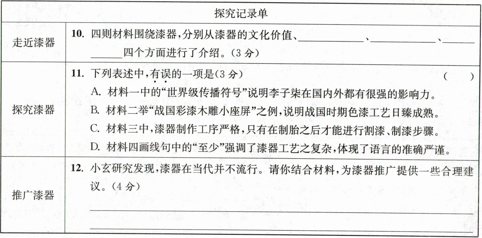 |走近漆器|10. 四则材料围绕漆器,分别从漆器的文化价值、______、______、______四个方面进行了介绍。(3 分)|