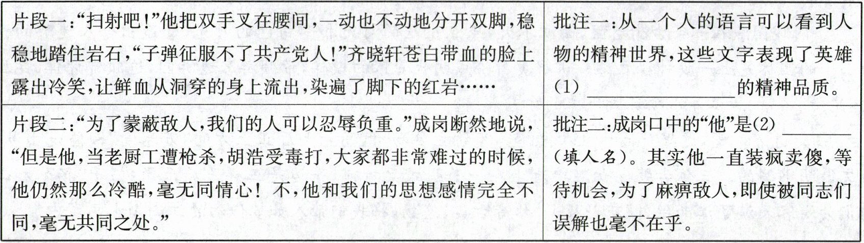 |片段一:"扫射吧!"他把双手叉在腰间,一动也不动地分开双脚,稳稳地踏住岩石,"子弹征服不了共产党人!"齐晓轩苍白带血的士的脸上露出冷笑,让鲜血从洞穿的身上流出,染遍了脚下的红岩……|批注一:从一个人的语言可以看到人物的精神世界,这些文字表现了英雄(1)______ 的精神品质。| |片段二:"为了蒙蔽敌人,我们的人可以忍辱负重。"成岗断然地说,"但是他,当老厨工遭枪杀,胡浩受毒打,大家都非常难过的时候,他仍然那么冷酷,毫无同情!不,他和我们的思想感情完全不同,毫无共同之处。"|批注二:成岗口中的"他"是(2)______(填人名)。其实他一直装疯卖傻,等待机会,为了麻痹敌人,即使被同志们误解也毫不在乎。|