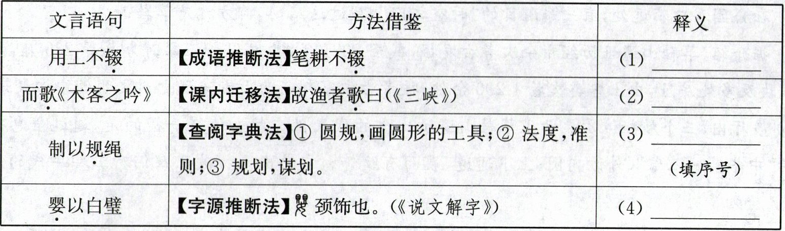 |而歌《木客之吟》|【课内迁移法】故渔者歌曰(《三峡》)|(2)______|