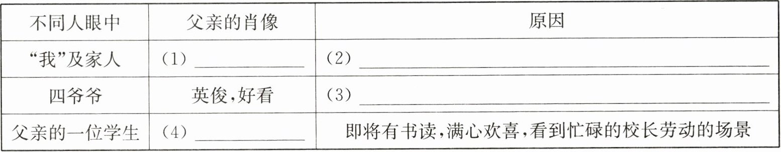 16. 新趋势 脉络梳理【典型事件忆人物】在不同人的眼中,父亲的肖像各是怎样的?不同的肖像又是出于怎样的原因?请阅读全文填写下表。(4 分)