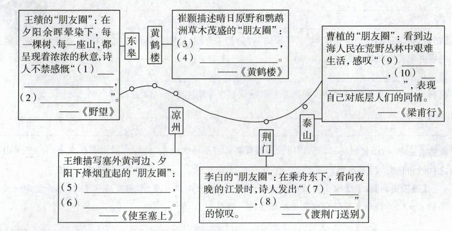 6. (2025·山东聊城期中)古人纪念出行的方式是写诗文和绘画,他们的“朋友圈”是优雅的“朋友圈”。请根据提示填写相应古诗文。(10分)