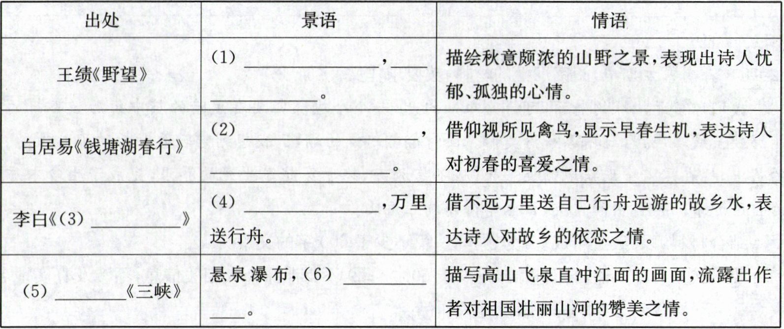 | 王绩《野望》 | (1)______,______。 | 描绘秋意颇浓的山野之景,表现出诗人忧郁、孤独的心情。 |
