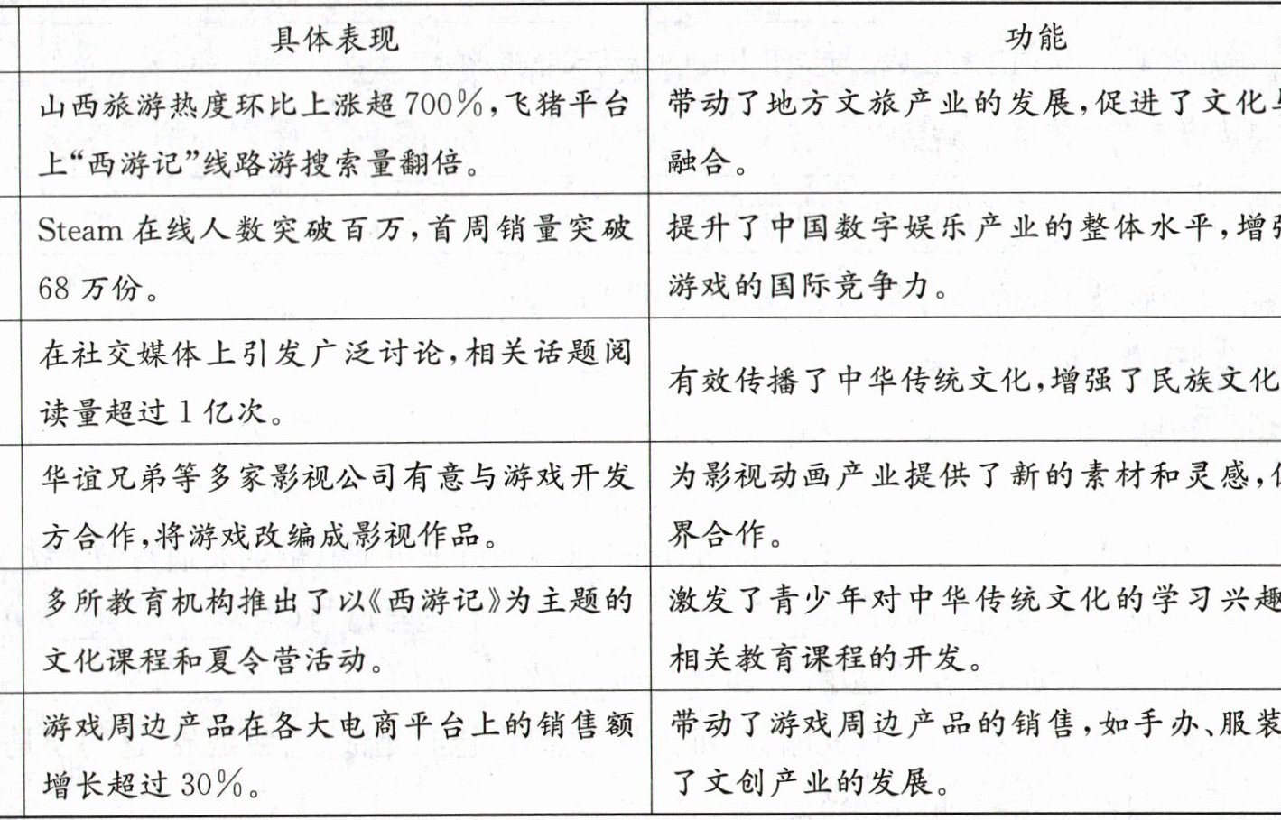 9. C 【解析】根据材料三“《黑神话:悟空》的成功不仅体现在游戏本身,还在于其对文化旅游、数字娱乐、传统文化传播、影视动画、教育培训以及周边产品等多个产业和行业的积极影响,为其他文化产品提供了借鉴”与表格内容可知,《黑神话:悟空》确实对影视动画和教育课程产生了积极影响,但材料并未提及这些领域实现了国际传播。 10. 示例:引起了一场关于中国游戏和中华传统文化的广泛关注 11. (1)政策引导和支持 (2)创新文化传播方式 (3)文化产业融合发展