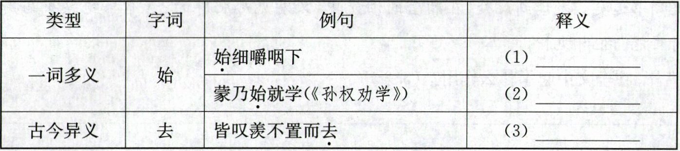 |一词多义|始|始细嚼咽下|(1)______|