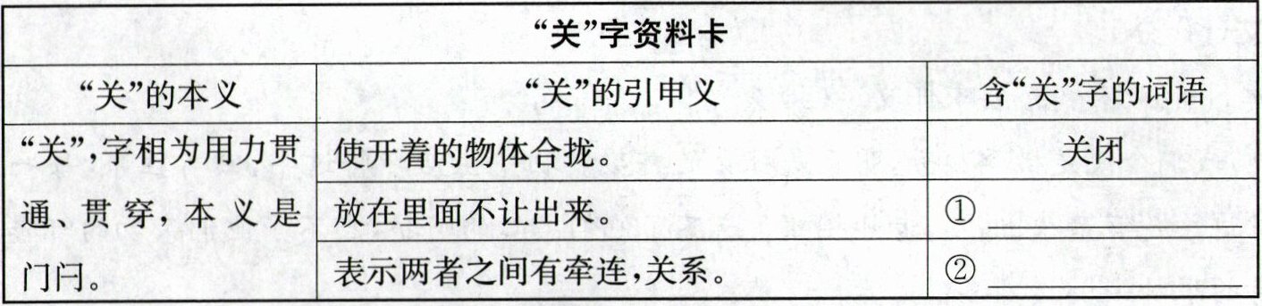 (2) 下面是小竹整理的关于"关"字的资料卡片,请你根据提示,在①②处分别补充一个含"关"字的词语。(2 分)