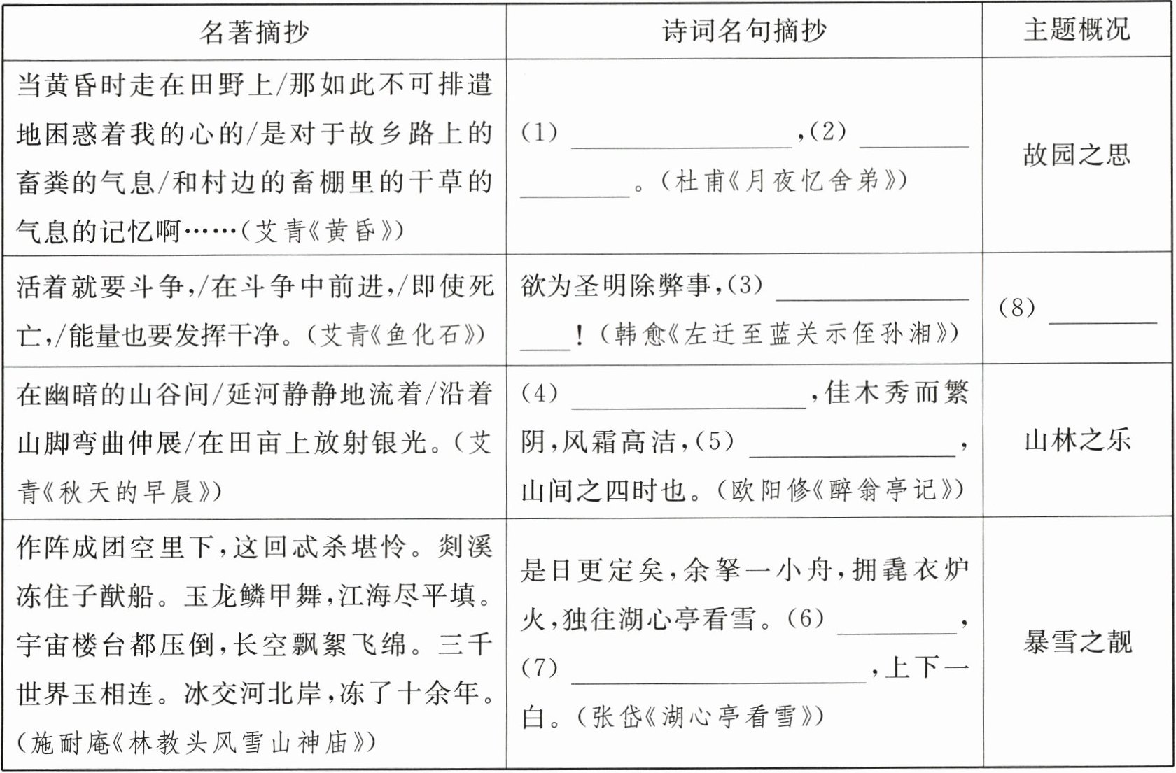 4. 亮点原创 同学们分享《艾青诗选》《水浒传》时,将名著和课本中古诗文进行联读。请完成下面联读表格。(8分)
