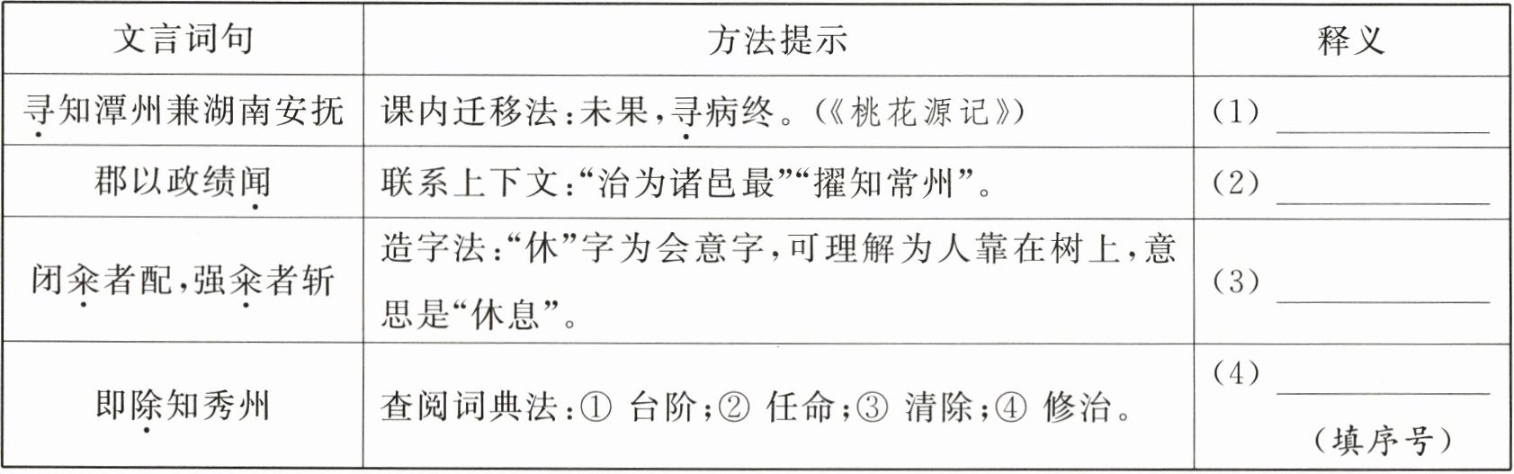 |即除知秀州|查阅词典法:① 台阶;② 任命;③ 清除;④ 修治。|(4)______(填序号)|