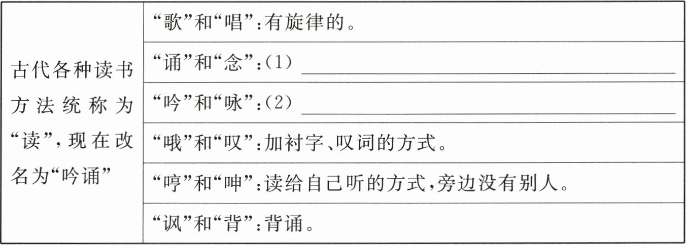 |古代各种读书方法统称为"读",现在改名为"吟诵"|"歌"和"唱":有旋律的。"诵"和"念":(1) ______"吟"和"咏":(2) ______"哦"和"叹":加衬字、叹词的方式。"哼"和"呻":读给自己听的方式,旁边没有别人。"讽"和"背":背诵。|