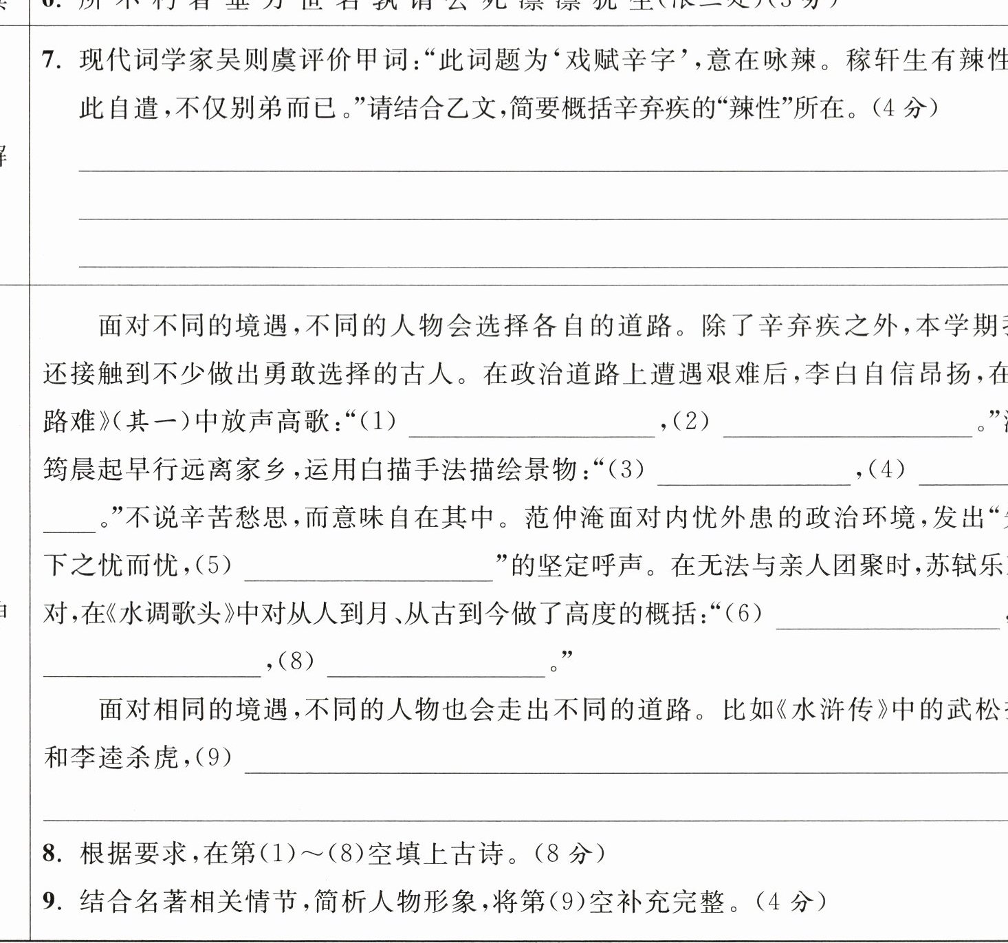 |拓展延伸|面对不同的境遇,不同的人物会选择各自的道路。除了辛弃疾之外,本学期我们还接触到不少做出勇敢选择的古人。在政治道路上遭遇艰难后,李白自信昂扬,在《行路难》(其一)中放声高歌:“(1) ______,(2) ______。”温庭筠晨起早行远离家乡,运用白描手法描绘景物:“(3) ______,(4) ______。”不说辛苦愁思,而意味自在其中。范仲淹面对内忧外患的政治环境,发出“先天下之忧而忧,(5) ______”的坚定呼声。在无法与亲人团聚时,苏轼乐观以对,在《水调歌头》中对从人到月、从古到今做了高度的概括:“(6) ______,(7) ______,(8) ______。”面对相同的境遇,不同的人物也会走出不同的道路。比如《水浒传》中的武松打虎和李逵杀虎,(9) ______。|