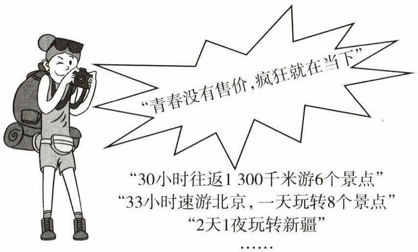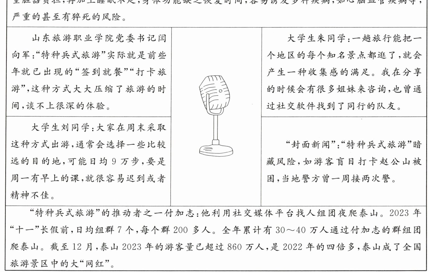 (二) 新素材 热点话题 (2024·浙江绍兴期末改编)“特种兵式旅游”成为当下年轻人中最为流行的旅游方式,但也有不同声音出现。同学们搜集了以下材料,请你阅读并完成任务。(14 分)