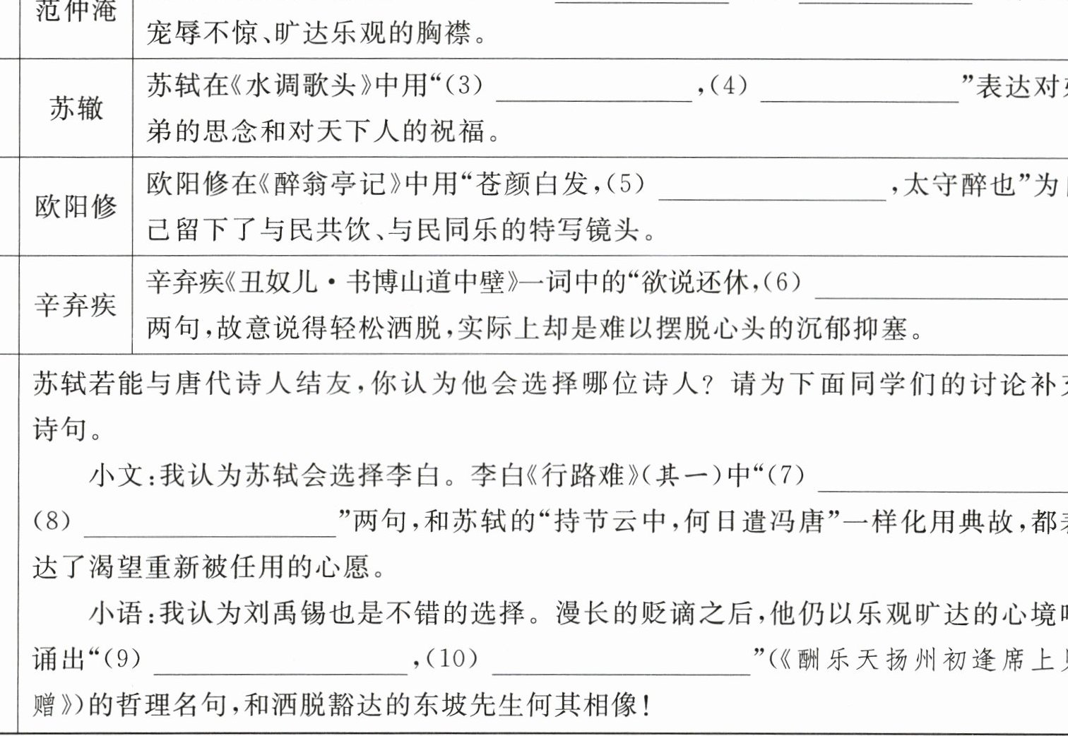 | 迁移拓展 | | 苏轼若能与唐代诗人结友,你认为他会选择哪位诗人? 请为下面同学们的讨论补充诗句。小文:我认为苏轼会选择李白。李白《行路难》(其一)中“(7)______,(8)______”两句,和苏轼的“持节云中,何日遣冯唐”一样化用典故,都表达了渴望重新被任用的心愿。小语:我认为刘禹锡也是不错的选择。漫长的贬谪之后,他仍以乐观旷达的心境吟诵出“(9)______,(10)______”(《酬乐天扬州初逢席上见赠》)的哲理名句,和洒脱豁达的东坡先生何其相像! |