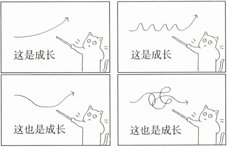 【写作导引】这是一道漫画作文题。观察四幅漫画,有一只猫用教棍指着不同形状的线条,并重复说“这是成长”“这也是成长”。从漫画内容来看,成长不再局限于一种直线上升的、顺利的模式,而是有波折、有曲折,甚至有迂回的过程。立意方向可以是:成长是多元化的,它不是一帆风顺的直线,而是充满曲折和变化的过程;我们应该正确看待成长中的挫折和困难,因为它们也是成长的一部分。本文可以写成记叙文,选择自己的生活片段来写,叙写自己在成长过程中的深刻感悟;也可以写成议论文,明确自己对成长的认识,论证“成长的路上并非一帆风顺”的相关论点,可选用名人成长的事例或者相关的名人名言来证明自己的观点。结尾要升华主题,点明文章主旨。