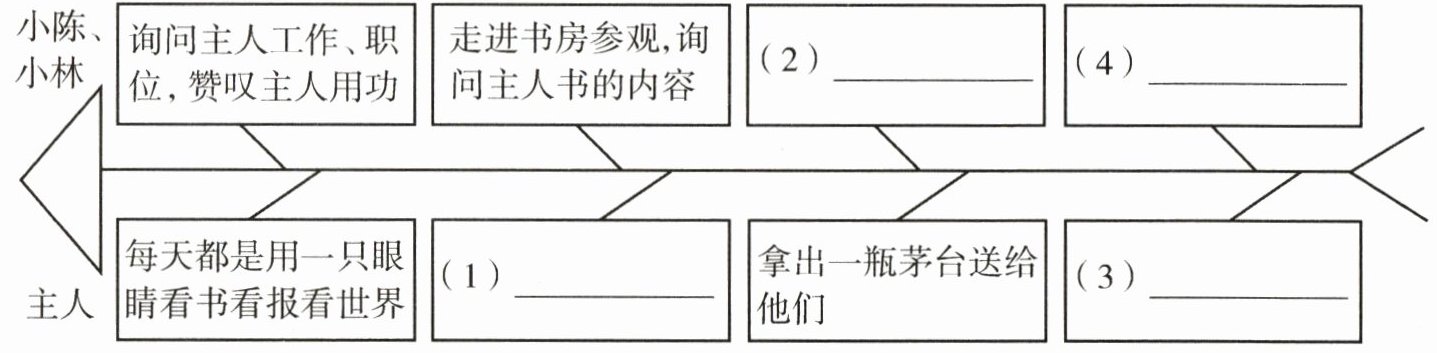 18.(1)讲武士和老禅师的故事 (2)喝了劣质酒,干活儿没精神 (3)偷偷给他们两百元奖金 (4)归还多出的两百元钱 19. 坚持用一只眼睛阅读,退休后仍对工作充满热爱;通过故事讲述人生感悟,为人豁达通透;给工人赠送名酒,慷慨大方;用行动引导感化小陈、小林,善良睿智。 20. 示例一:选 A 句。主人怎么多给我们两百块工钱,是他数错了还是我们看错了?如果真的多给了两百块钱,我们也先装作不知情,找个没人的地方,再重新数数。 示例二:选 B 句。小林:果真是多给了两百块工钱,但我们也没偷没抢,是主人给多了,只能怪他眼神有问题。小陈:主人真的多给了我们两百块钱,如果就这样一走了之,不仅是不劳而获,也有愧于他对我们的善意。善恶就在一念之间,不能因为贪小便宜,干了坏事,成了坏人。 21. 示例:不矛盾。上文中提到的刘亮德“只有一只眼睛能看见”是因为刘亮德有眼疾,是生理缺陷;而文章最后一段并不是说刘亮德的眼睛真的能看见了,而是刘亮德用哲理故事启发小陈和小林对善恶的思考,用善意的行为引导感化他们,使他们逐步感悟并实现了从恶到善的转变,整个过程刘亮德心中洞若观火,眼睛在精神层面变得“明亮有神”,所以说小陈和小林觉得刘亮德另一只眼睛好像已经好了。