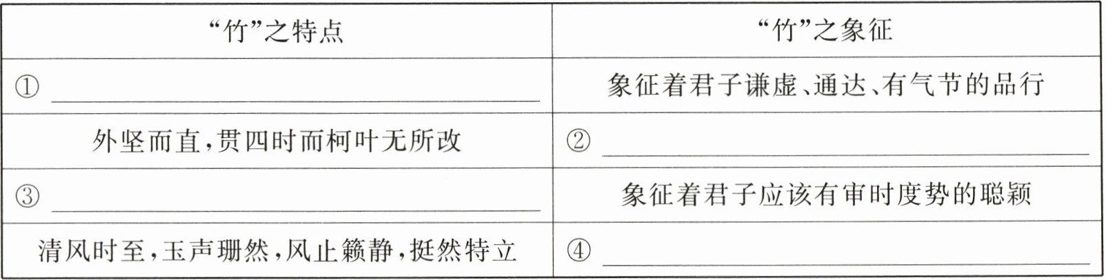 (1) 托物言志是一种常见的表现手法,即将个人之“志”寄寓在某个具体的“物”上,“物”便具有了某种象征意义,成为作者的志趣、意愿或理想的寄托。王守仁在文中将个人理想寄托在“竹子”上,请根据提示,完成下表。(4 分)