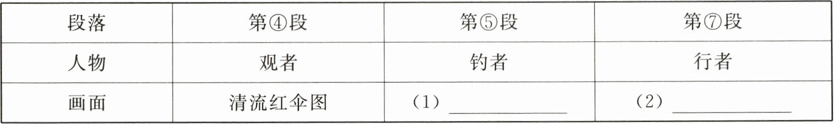 17.(1)雾雨垂钓图 (2)步道光影图 (3)示例一:⑤ 特写镜头 钓者潇洒自然地甩出钓钩,发丝沾着雨丝,眼中满是从容。作者钦佩钓者洒脱淡定的心境,内心随之远离世事嚣烦。 示例二:⑦ 近景镜头 大雨中,两人执伞前行,眉眼弯弯,脚步轻快,在映着红光的步道上溅起朵朵水花,光影闪烁。作者心中豁然,似开出一朵春花。