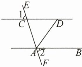 13. (10分)如图,直线 EF 分别与直线 AB,CD 相交于 A,C 两点,AD 平分$∠BAC$交 CD 于点 D.若$∠1= ∠2$,且$∠ADC= 54^{\circ }$.