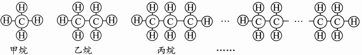 C₁₂H₂₆ 解析:由题图,得甲烷的化学式中C有1个,H有2+2×1=4(个);乙烷的化学式中C有2个,H有2+2×2=6(个);丙烷的化学式中C有3个,H有2+2×3=8(个)……以此类推,所以十二烷的化学式中C有12个,H有2+2×12=26(个),即十二烷的化学式为C₁₂H₂₆.