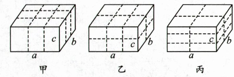 25.(6分)有一形状为长方体的物体,它的长、宽、高分别为$a$,$b$,$c(a > b > c)$.现用三种不同的方式捆扎该物体(如图所示的虚线),哪种方式用绳最少?哪种方式用绳最多?