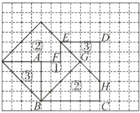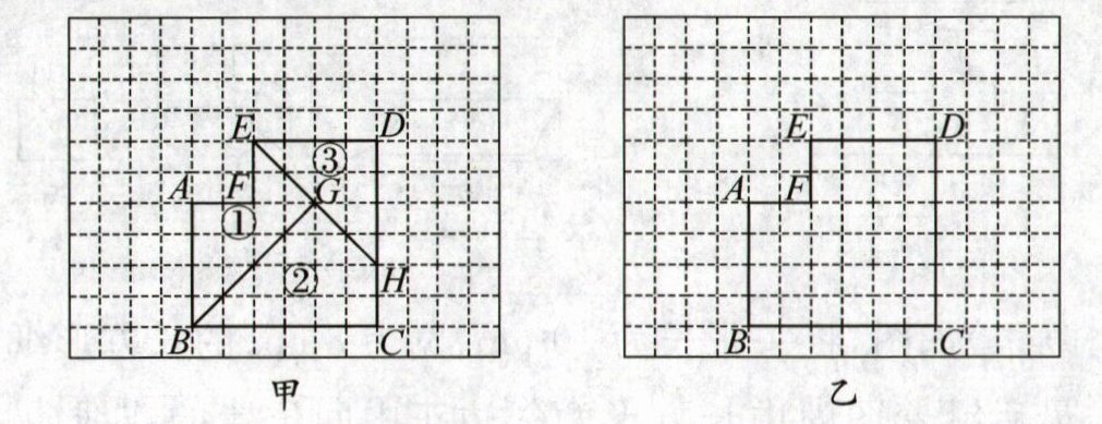 (1) 如方格纸甲,把六边形 ABCDEF 沿 EH,BG 剪成①②③三部分,请在方格纸甲中保持①不动,画出拼成的正方形,然后标出②③变动后的位置,并指出②③属于旋转、平移和翻折中的哪一种变换;