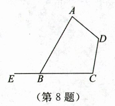 8. 如图,在四边形 ABCD 中,$∠A+∠C= 180^{\circ },∠D= 120^{\circ },∠ABE$是四边形 ABCD 的一个外角,则$∠ABE$的度数是____