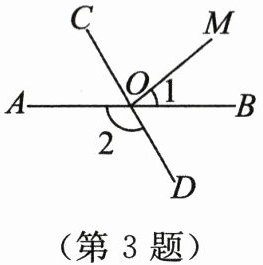 3. (2024·山东日照)如图,直线 $ AB $,$ CD $ 相交于点 $ O $.若 $ ∠1= 40^{\circ} $,$ ∠2= 120^{\circ} $,则 $ ∠COM $ 的度数为 (