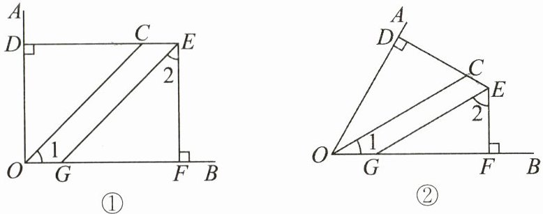 $ ^{\circ} $;(2) 如图②,当 $ ∠AOB $ 为锐角时,$ ∠1 $ 与 $ ∠2 $ 之间有什么数量关系? 请说明理由;