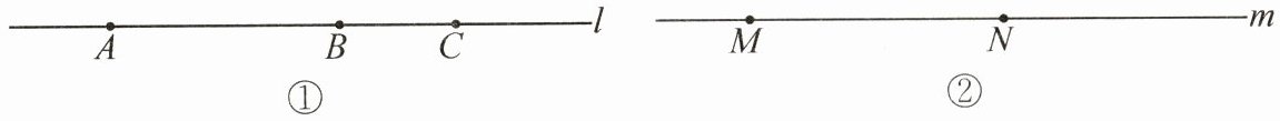 24. (6 分)新素养 应用意识 (2025·江苏镇江期末)已知直线 $ l $ 上有 $ A $,$ B $,$ C $ 三个点.若满足 $ BC= \frac{1}{2}AB $,则称 $ C $ 是点 $ A $ 关于点 $ B $ 的“半距点”.如图①,$ A $,$ B $,$ C $ 三点在直线 $ l $ 上,且 $ BC= \frac{1}{2}AB $,此时 $ C $ 就是点 $ A $ 关于点 $ B $ 的一个“半距点”.如图②,若 $ M $,$ N $,$ P $ 三点在同一条直线 $ m $ 上,且 $ P $ 是点 $ M $ 关于点 $ N $ 的“半距点”,$ MN= 6cm $.