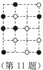 11. 如图,棋盘上有黑、白两色棋子若干.若直线 $l$ 经过 3 枚颜色相同的棋子,则这样的直线共有