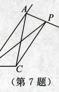 7. 如图,AD是$△ABC$外角的平分线,P是AD上异于点A的任意一点,连接PB,PC.设$PB= m,PC= n,AB= c,AC= b$,则$m+n与b+c$之间的大小关系是 ( )