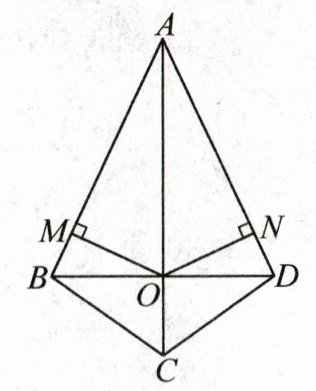 在△ABC和△ADC中,$\left\{\begin{array}{l} AB=AD,\\ BC=DC,\\ AC=AC,\end{array}\right. $所以$△ABC\cong △ADC$(SSS),所以$∠BAC = ∠DAC$。因为OM⊥AB,ON⊥AD,所以$∠OMA = ∠ONA = 90^{\circ }$。在△AOM和△AON中,$\left\{\begin{array}{l} ∠OMA=∠ONA,\\ ∠OAM=∠OAN,\\ OA=OA,\end{array}\right. $所以$△AOM\cong △AON$(AAS),所以AM = AN,OM = ON,所以四边形AMON是筝形。