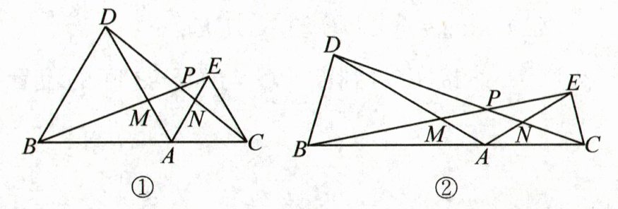 25. (8分)如图,点A,B,C在同一条直线上,分别以AB,AC为腰,在BC的同侧作等腰三角形,使$AD= AB,AE= AC$,BE,DC交于点P,BE与AD交于点M,DC与AE交于点N.
