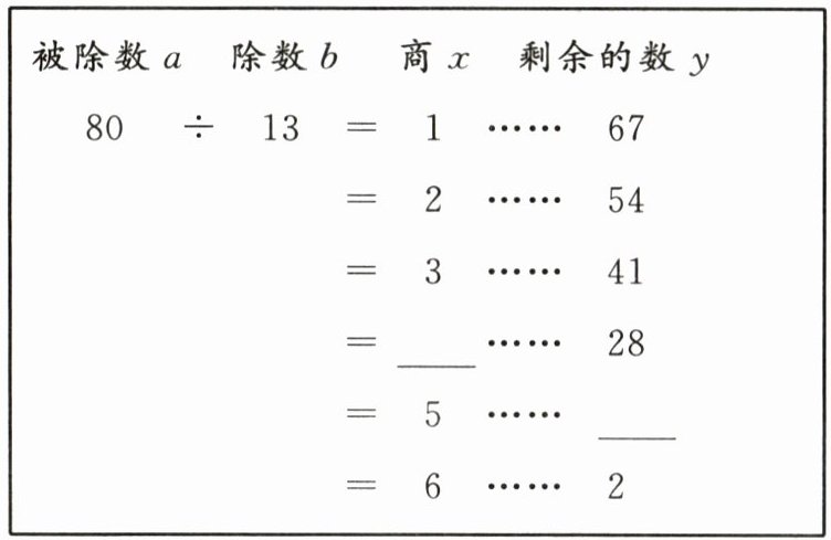 24. (8 分)新素养 应用意识模仿小学学习过的有余数的除法,我们可以在非负整数范围内将被除 数$a$、除数$b$、商$x和剩余的数y$之间的关系用下面的形式表示(以$a= 80,b= 13$为例):