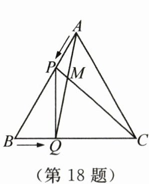 18. (2025·江苏淮安模拟)如图,$\triangle ABC是边长为4cm$的等边三角形,点$P从点A$出发,沿边$AB向点B$运动,同时点$Q从点B$出发,沿边$BC向点C$运动,且它们的速度都为$1cm/s$,连接$AQ,CP相交于点M$,连接$PQ$.设运动的时间为$t\;s$.给出下面四个结论:①$BP= CM$;②$\triangle ABQ\cong \triangle CAP$;③$\angle CMQ$的度数不变,始终等于$60^{\circ }$;④当$t= \frac {4}{3}或\frac {8}{3}$时,$\triangle PBQ$为直角三角形.其中正确的是______.(填序号)
