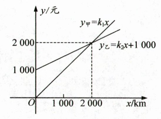 (2) 把点$(2000,2000)$代入$y_{\text{乙}}=k_{2}x+1000$,得$2000k_{2}+1000=2000$,解得$k_{2}=0.5$.故$y_{\text{乙}}$与$x$之间的函数表达式为$y_{\text{乙}}=0.5x+1000(x\geq0)$.