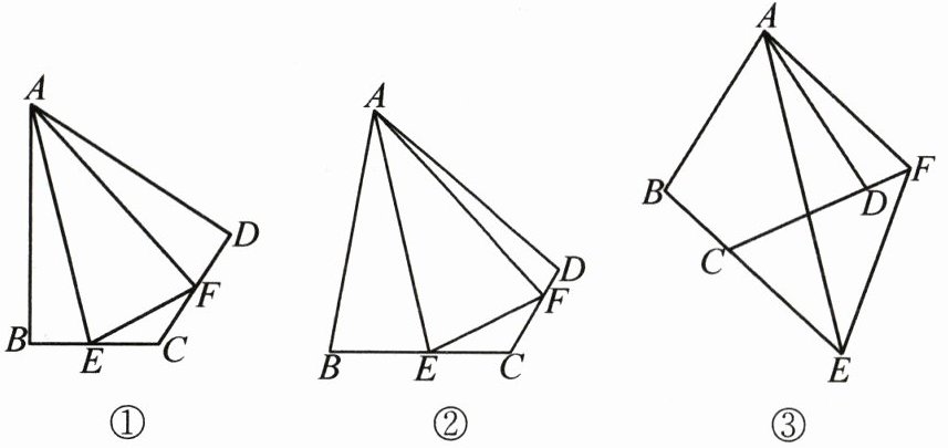 (1) 如图①,在四边形ABCD中,$AB= AD,∠ABC= ∠ADC= 90^{\circ },E,F$分别是边BC,CD上的点,且$∠EAF= \frac {1}{2}∠BAD$.求证:$EF= BE+DF$;