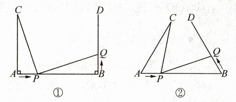 (1)△ACP 与△BPQ 全等,此时 PC⊥PQ.理由如下:当 t=1 时,AP=BQ=1 cm.因为 AB=4 cm,所以 BP=AB-AP=3 cm.因为 AC=3 cm,所以 AC=BP.因为 AC⊥AB,BD⊥AB,所以∠A=∠B=90°.在△ACP和△BPQ 中,$\left\{\begin{array}{l} AP=BQ,\\ ∠A=∠B,\\ AC=BP,\end{array}\right. $所以△ACP≌△BPQ(SAS),所以∠ACP=∠BPQ,所以∠APC+∠BPQ=∠APC+∠ACP=90°,所以∠CPQ=180°-(∠APC+∠BPQ)=90°,所以 PC⊥PQ.
