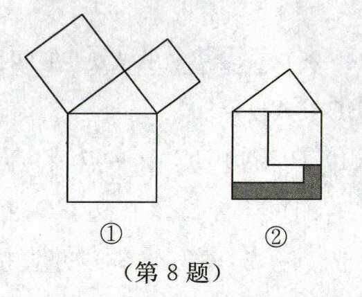 8. 勾股定理是人类最伟大的科学发现之一,在我国古算书《周髀算经》中早有记载.如图①,以直角三角形的各边为边分别向外作正方形,再把较小的两张正方形纸片按如图②所示的方式放置在最大的正方形内.若知道图②中阴影部分的面积,则一定能求出 (