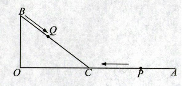 20. (4 分)如图,已知$∠AOB = 90^{\circ}$,点 C 在边 OA 上,$OA = 36$cm,$OB = 12$cm,点 P 从点 A 出发,沿着 AO 方向匀速运动,点 Q 同时从点 B 出发,以相同的速度沿 BC 方向匀速运动.若 P,Q 两点恰好在点 C 处相遇,求 BC 的长.