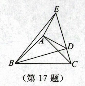 17. 新素养 推理能力 如图,在$\triangle ABC和\triangle ADE$中,$∠BAC = ∠DAE = 90^{\circ}$,$AB = AC$,$AD = AE$,点 C,D,E 在同一条直线上,连接 BD,BE. 给出下列结论:①$BD = CE$;②$BD⊥CE$;③$∠ACE + ∠DBC = 45^{\circ}$;④$BE^{2} = 2(AD^{2} + AB^{2})$.其中正确的是______.(填序号)
