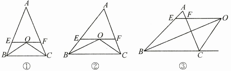(3)如图③,若$∠ABC的平分线BO与\triangle ABC的外角平分线CO交于点O$,过点$O作OE// BC交AB于点E$,交$AC于点F$.这时图中还有等腰三角形吗? $EF与BE,CF$之间的关系又如何? 说明你的理由.
