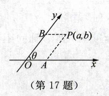 17. (2025·江苏连云港模拟)如图,把平面内一条数轴 $ x $ 绕原点 $ O $ 逆时针旋转角 $ \theta(0^{\circ} \lt \theta \lt 90^{\circ}) $ 得到另一条数轴 $ y $,$ x $ 轴和 $ y $ 轴构成一个平面斜坐标系. 规定:过点 $ P $ 作 $ y $ 轴的平行线,交 $ x $ 轴于点 $ A $,过点 $ P $ 作 $ x $ 轴的平行线,交 $ y $ 轴于点 $ B $. 若点 $ A $ 在 $ x $ 轴上对应的实数为 $ a $,点 $ B $ 在 $ y $ 轴上对应的实数为 $ b $,则称有序实数对 $ (a,b) $ 为点 $ P $ 的斜坐标. 在某平面斜坐标系中,已知 $ \theta = 60^{\circ} $,点 $ M $ 的斜坐标为 $ (3,2) $,点 $ N $ 与点 $ M $ 关于 $ y $ 轴对称,则点 $ N $ 的斜坐标为______.