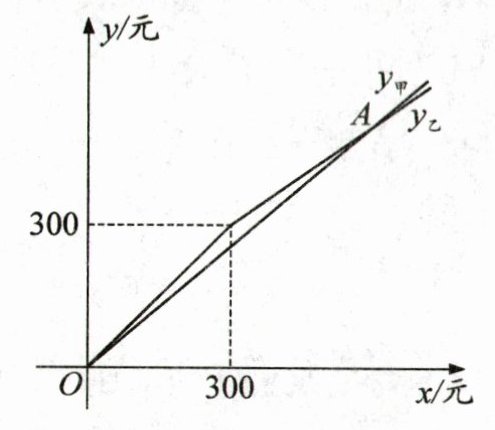 (1)由题意,得y甲关于x的函数表达式为y甲 = 0.85x.当0≤x≤300时,y乙 = x;当x>300时,y乙 = 300 + 0.7(x - 300)=0.7x + 90.综上所述,y乙关于x的函数表达式为y乙 = {x(0≤x≤300),0.7x + 90(x>300)}.