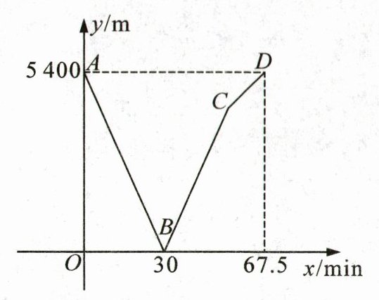 (2)①观察题图可知:甲、乙两地相距5400m,小丽从甲地到乙地用了67.5min,所以小丽步行的速度是5400÷67.5 = 80(m/min).因为小丽与小明出发30min相遇,所以小明步行的速度是5400÷30 - 80 = 100(m/min).②因为小明步行的速度是100m/min,所以小明从乙地到甲地所用的时间为5400÷100 = 54(min),所以点C的横坐标为54.因为小丽步行的速度是80m/min,所以出发54min时小丽离甲地80×54 = 4320(m),所以点C的纵坐标为4320,所以点C的坐标为(54,4320).点C的实际意义:两人出发54min时,小明到达甲地,小丽离甲地4320m.