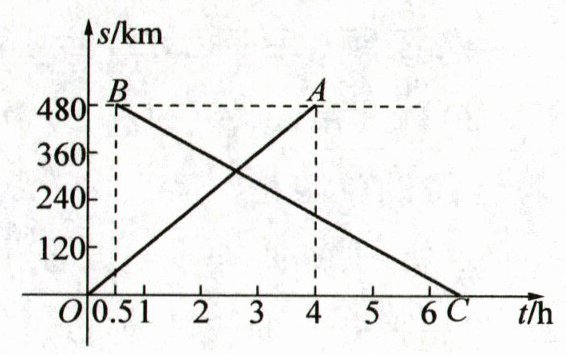 (3)①因为480÷80 + 0.5 = 6.5(h),所以C(6.5,0).设线段BC的函数表达式为s = kt + b(0.5≤t≤6.5).把点B(0.5,480),C(6.5,0)分别代入s = kt + b,得{0.5k + b = 480,6.5k + b = 0},解得{k = - 80,b = 520},所以s = - 80t + 520.故线段BC的函数表达式为s = - 80t + 520(0.5≤t≤6.5).