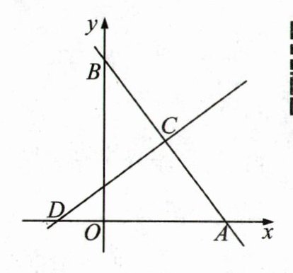 (1),得点 A 的坐标为(6,0),点 B 的坐标为(0,8),所以点 C 的坐标为(3,4).设点 D 的坐标为$(t,0)$,则$AD^{2}=(6-t)^{2},BD=(0-t)^{2}+(8-0)^{2}=t^{2}+64$.所以$(6-t)^{2}=t^{2}+64$,解得$t=-\frac{7}{3}$.所以点 D 的坐标为$(-\frac{7}{3},0)$.设直线 CD 的函数表达式为$y=kx+b$.将 C(3,4),$D(-\frac{7}{3},0)$分别代入,得$\left\{\begin{array}{l} 3k+b=4\\ -\frac{7}{3}k+b=0\end{array}\right.$,解得$\left\{\begin{array}{l} k=\frac{3}{4}\\ b=\frac{7}{4}\end{array}\right.$.则直线 CD 的函数表达式为$y=\frac{3}{4}x+\frac{7}{4}$.