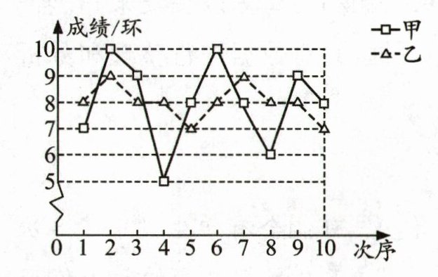 (2) 观察折线统计图,直接写出甲、乙两名同学这 10 次射击训练成绩的方差 $ s_{甲}^2,s_{乙}^2 $ 的大小关系;