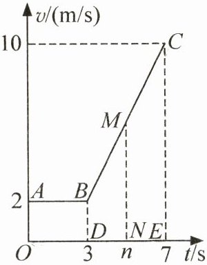 26. (8分)新趋势 学科融合 某物体从点P沿直线运动到点Q所用的时间为7s,其运动速度$v(m/s)关于时间t(s)$的函数关系如图所示.某数学兴趣小组经过探究发现:该物体前3s运动的路程在数值上等于矩形AODB的面积;由物理学知识还可知:该物体前$n\ s(3<n≤7)$运动的路程在数值上等于矩形AODB的面积与梯形BDNM的面积之和.